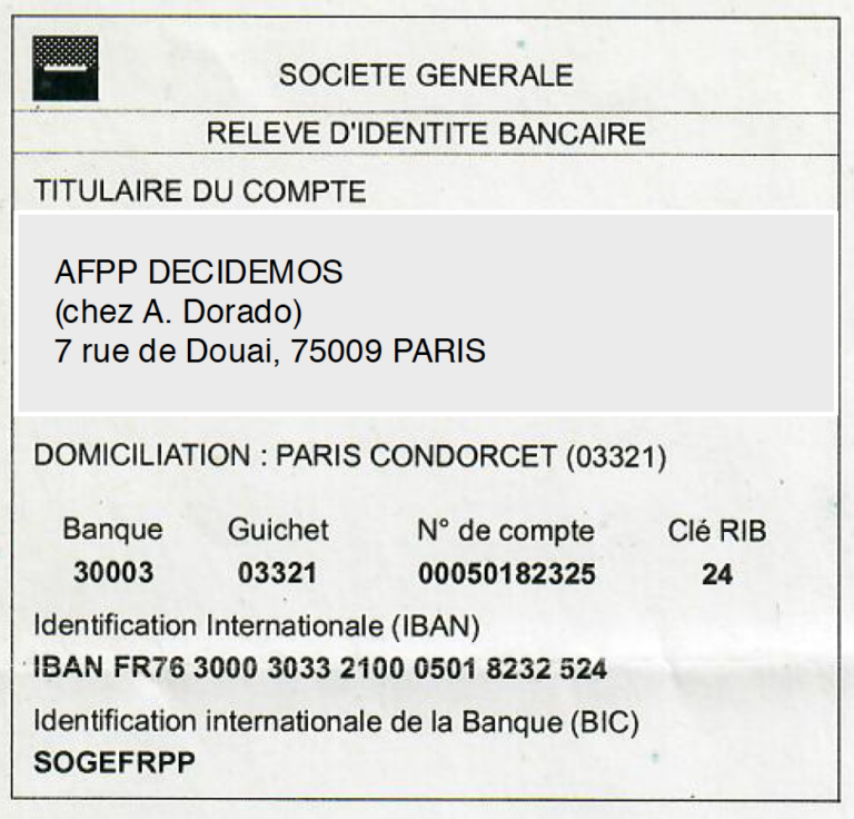 L'AFPP de DECIDEMOS a un compte bancaire qui a été ouvert à la suite d'une décision judiciaire en référé contre la banque Société Générale S.A. (SG) prononcée le 15/03/2019 par le Tribunal Judiciaire de Paris